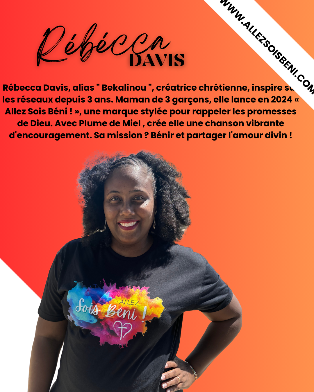 Rébecca DAVIS est une créatrice de contenu chrétien depuis maintenant près de trois ans. Épouse et mère de 3 garçons, elle partage sa foi sur les réseaux sociaux sous le pseudo de "Bekalinou" et encourage à travers des vidéos inspirantes. En Juin 2024, elle donne naissance à la marque 'Allez Sois Béni!', une initiative née pour rappeler les promesses de Dieu avec style et bienveillance. Pour le lancement de ce nouveau projet, elle fait appelle à Plume de Miel pour créer la chanson 'Allez Sois Béni', qui véhicule un message d'encouragement, à l'image du contenu qu'elle publie régulièrement sur les réseaux.