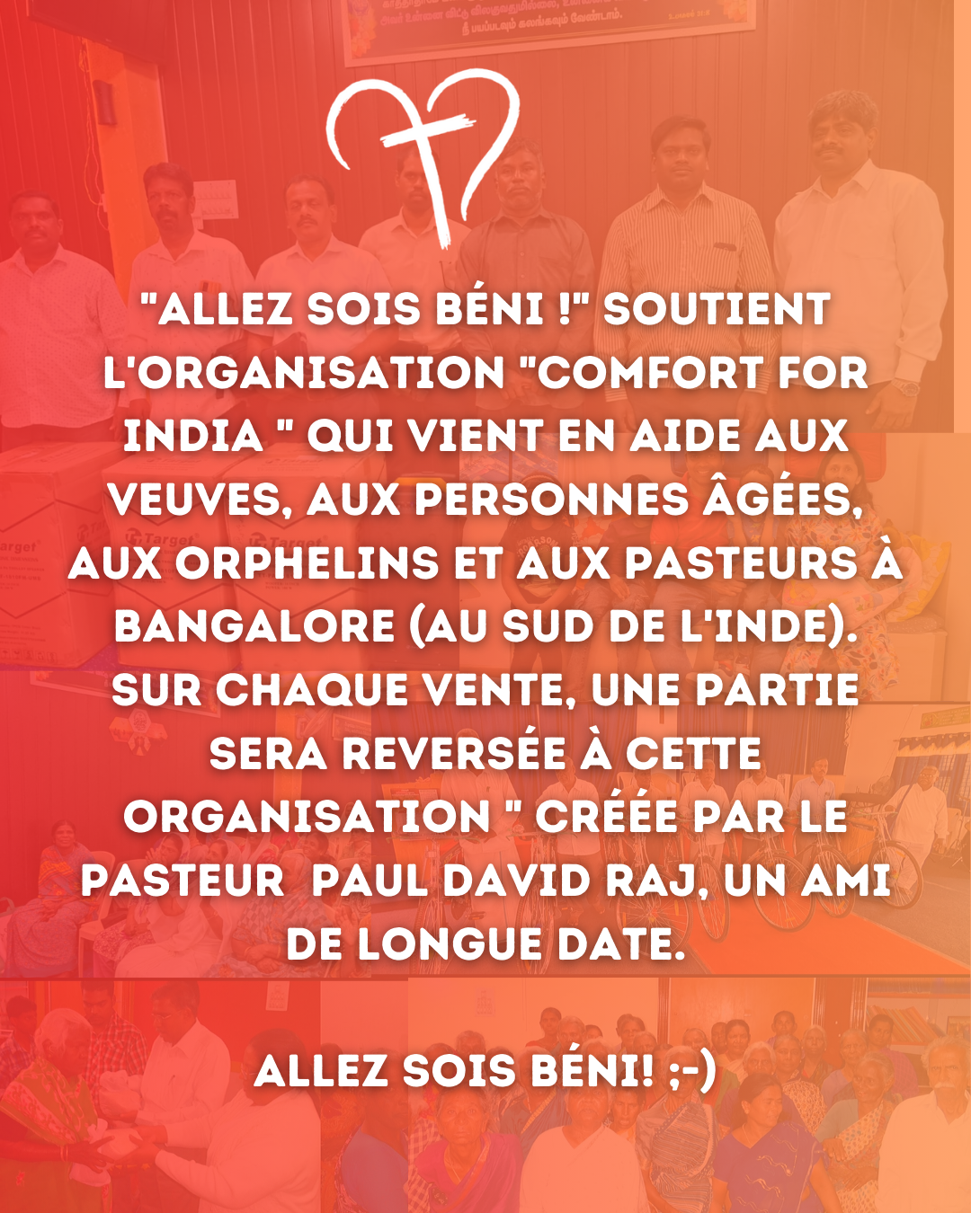 Engagée au-delà de ses créations, "Allez Sois Béni !" soutient également l'organisation "Comfort for India", ajoutant une dimension de solidarité à son message.